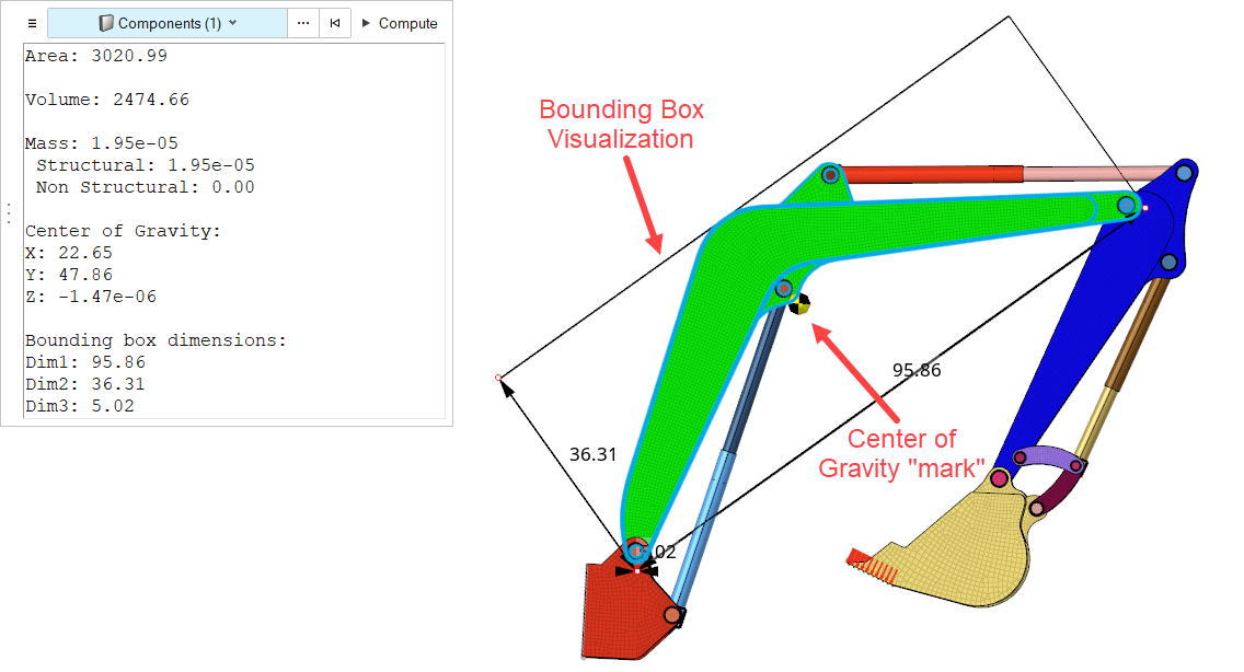 Summary measurements include areas, volumes, centers of gravity, bounding boxes, and the cumulative lengths of lines.
