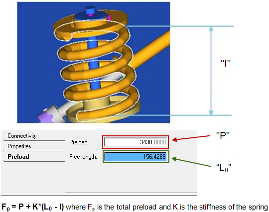 • For example, if the two end points of the defined spring (modeled length of spring) is 100 mm and the free-length is specified as 110, that represents the spring in a pre-deflected state by 10mm and the effective preload is 10*K; where K is the stiffness of the spring.