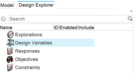 The Design Explorer Browser displays a hierarchical view of your design setup and can be used to enable and disable exploration parameters.