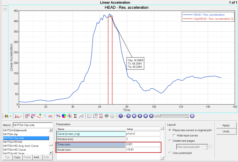 In the image below, units are not enabled for the selected curve. After loading the curve, select a vehicle safety tool (VST) function such as clip from the Injury menu. Without units enabled, you must manually enter the scaling factors in the Timv conv. and Accel conv. fields so that the curve fits properly.