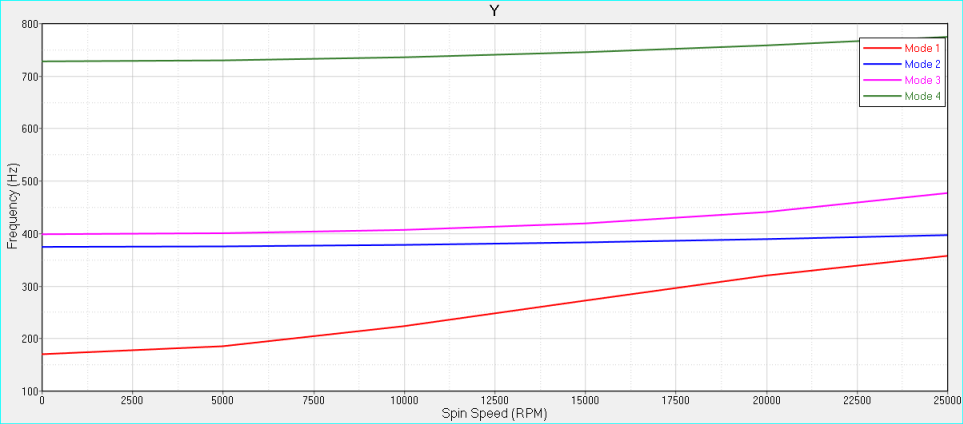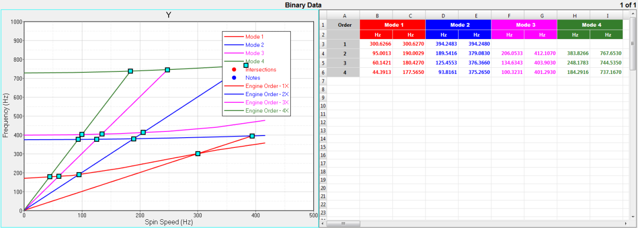 The Campbell Diagram plot and the summary table are displayed. The summary table on the right displays the information for the modes you selected to display in the plot. The colors used correspond to the mode colors in the plot.