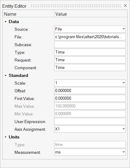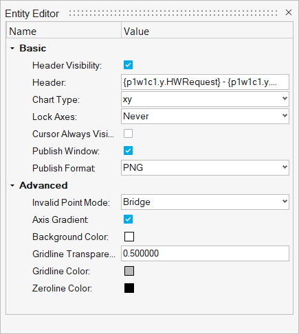 - Click Edit to display the Entity Editor, and edit the axis' properties. Change the axis color, label, label and tic font, and set the fixed range. See Axes View for more information on editing specific attributes.