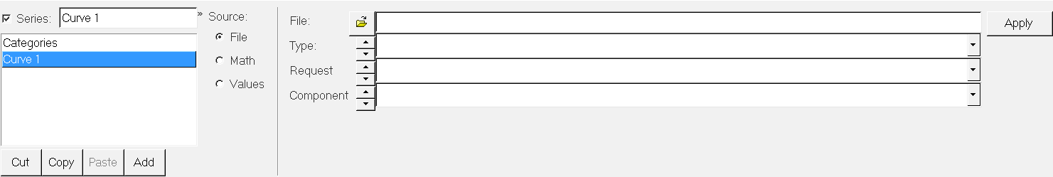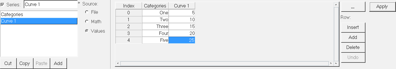 - Data point values can be entered directly into the Curve column in the Values table. Enter numbers in the Curve columns and click Apply. After adding a curve to the Curve list, a Curve column is displayed next to the Categories column. By default, a new curve is named Curve 1, Curve 2, and so on. If you change the name of the bar chart curve in the Curve list, the heading for the Curve column in the Values table also changes.