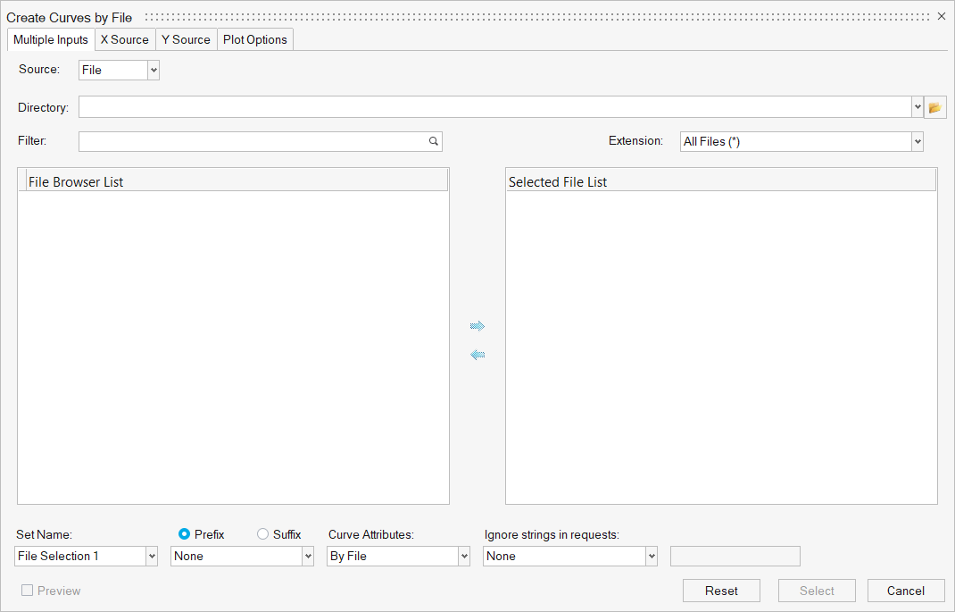 Note: If the selected files do not have data that intersects with the first selected file, the Type, Request and Component fields will be empty on the Y Source tab and a warning message will be displayed.