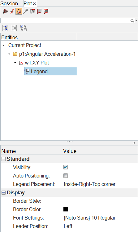 The Legends view, , displays only the legends in the session, grouped within their respective page and plot folders. Click Legend to display the legend's properties in the Entity Editor.