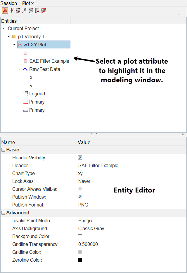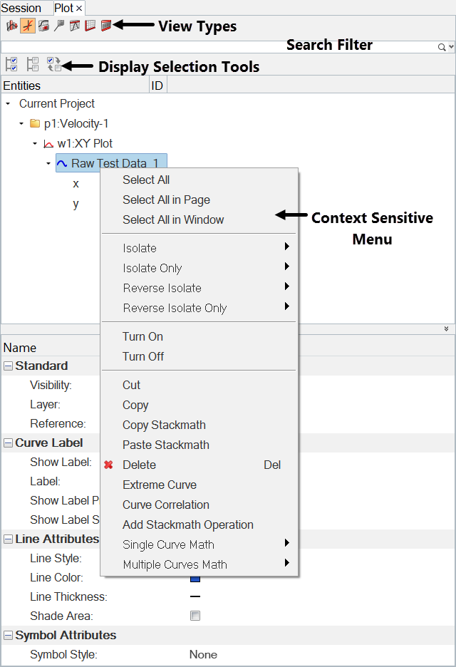 The Plot Browser tools allow you to search, display, and edit plot data within the current session. From the Plot Browser, you can select entities one at a time or several simultaneously using common selection techniques. You can also use the Plot Browser's context-sensitive menus to select entities. Many of the operations found in the HyperGraph panels can be performed in the Plot Browser, thus allowing you to modify your plot and curve properties in one location. Some of these operations include: