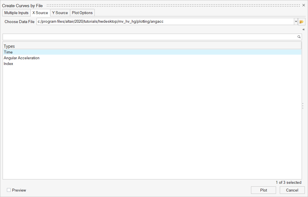 - Click the file browser button to locate the data file. X Source types, requests, and components are automatically populated based on multiple input selection or Y Source file selections.