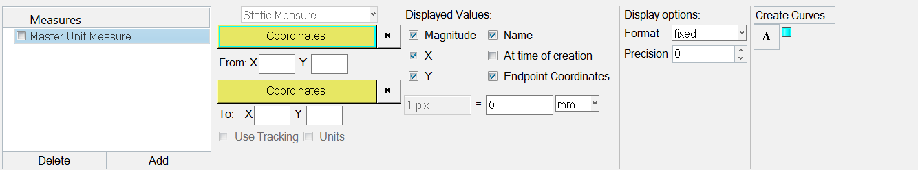 - The Units option is disabled by default if a master unit measure has not been defined. Once it is defined, this option is automatically enabled and checked. This specifies that the defined units and pixel conversion factor defined by the master unit measure should be used when showing the magnitude, Delta X, and Delta Y values, and when plotting any curves created from the measures. This is a global setting that applies to all measures.