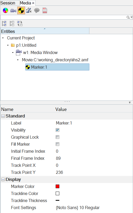The Markers view filters all Markers from all pages and windows in the current session and displays them in the respective hierarchy, with Markers and all its parent entities such as Movie (Media), Window and Page, as shown in the picture below.
