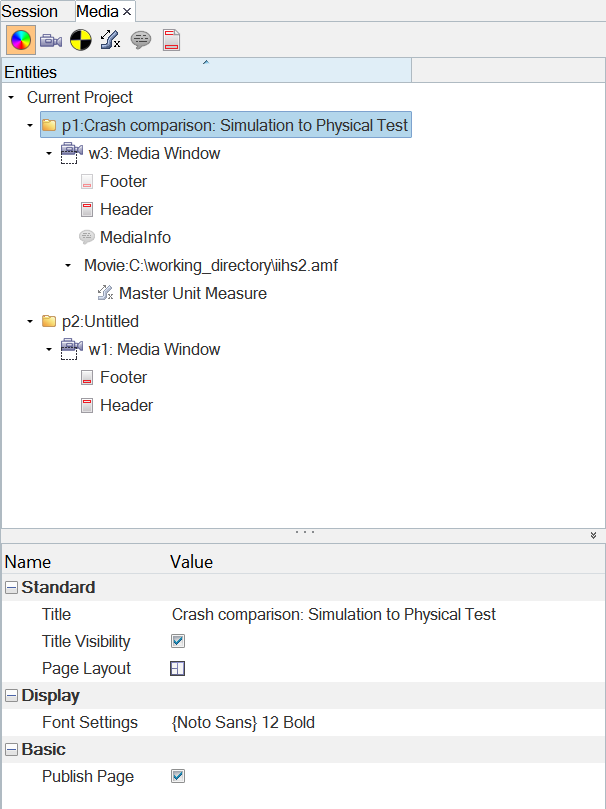 When a Media Browser view type is selected (Media Window, Movies, Markers, and so on) you can select the page folder at the top of the Media Browser tree to display its properties in the lower half of the browser (Properties Table).