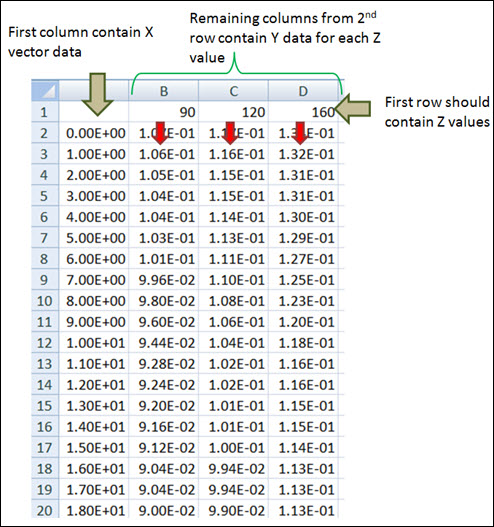 A 3D spline consists of a x-vector (or column) and more than one y-vector. Each y-vector is defined on a certain z-plane.