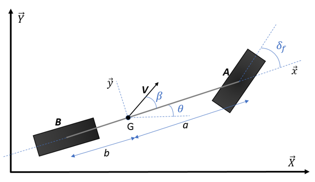 In Kinematic bicycle model, the equations of motion are based purely on geometric relationships governing the system. The major assumption used in the development of the kinematic model is that the velocity vectors at points A and B are in the direction of the orientation of the front and rear wheels respectively. This is equivalent to assuming that the "slip angles" at both wheels are zero. This is a reasonable assumption for low speed motion of the vehicle (for speeds less than 5 m/s). This model does not consider the vehicle’s dynamics such as slipping and skidding.