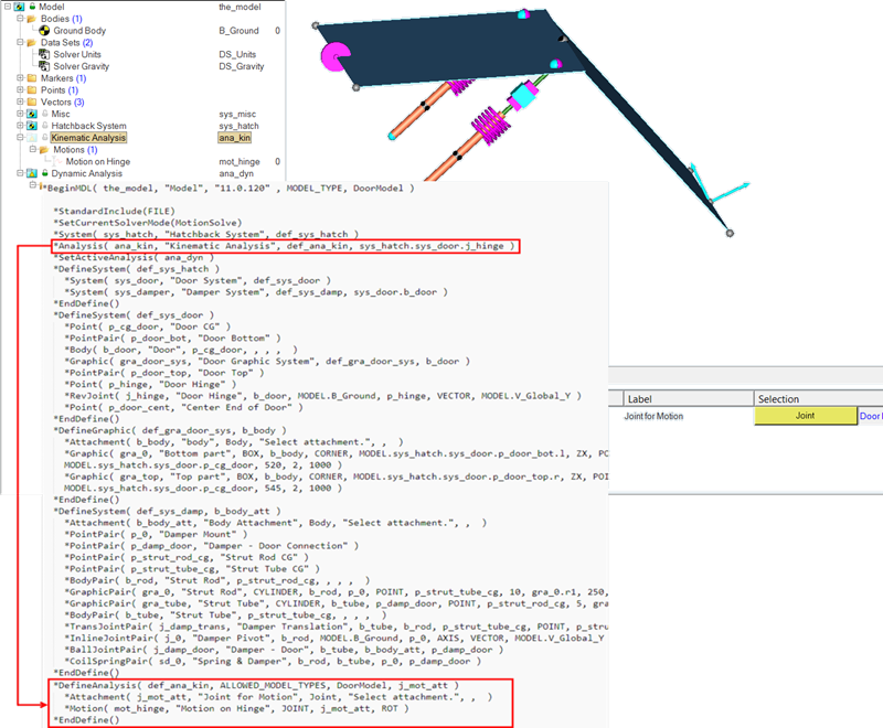 The following simple example model demonstrates the concept of an analysis. This model is available at ~hw_install/demos/mv_hv_hg/modeling/container_entities/system_analysis/door.mdl. The model has been arranged into a system called hatchback system, which in turn has two child systems; the door system and the damper system. The images below show a simplified model of a hatchback door of a car with the model MDL file shown alongside.