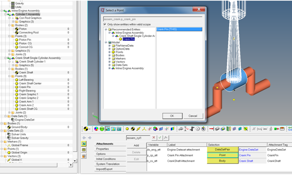 Upon clicking the Point collector for this attachment, the Model Tree that is automatically displayed in the Select a Point dialog will have a Recommended Entities folder which lists the crank pin point in the crankshaft assembly.