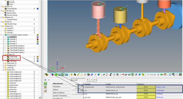 The image below shows a Cylinder 1 system in a four cylinder engine model. The Crankshaft and Engine Case bodies are external to the Cylinder 1 system. To define joints or forces between any of these bodies and bodies inside the Cylinder 1 system: attachments with variable names b_crankshaft and b_enginecase are declared as attachments to the system, and these two bodies are referred to as the variable entity.