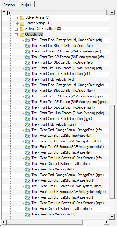Models built using MotionView will automatically include many output requests specific to the tires. The browser image below shows examples of these outputs: