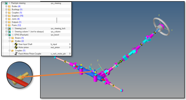 An Electric Power Assisted Steering System of a double pinion configuration is available in the Assembly Wizard plug-in for a Rack-pin style steering system in the Car/Small truck library and a Pitman steering system in the Heavy Truck library.
