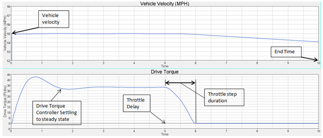 In this event, the vehicle drives at the vehicle velocity down a straight road and follows a line on the centerline of the road using the driver controller. The drive torque controller maintains the vehicle speed. At the throttle delay time, the drive torque begins to be removed and is removed over the throttle step duration time using a function. The event ends at the end time. Data is output to the plot and graphics files every time step seconds.
