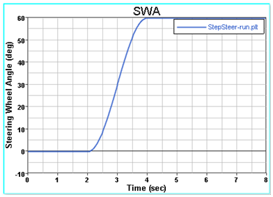 In this event, the vehicle is driven straight at an initial velocity of 55 mph for 2 seconds to reach steady state. From 2 to 4 seconds, the vehicle is steered from zero to the prescribed value (default is 60 degrees) using the function selected in the event form (sine, step or ramp). After 4 seconds, the steering wheel is held fixed at the same angle or torque until the end of the simulation.