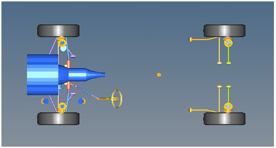 The front and rear wheel motions act on the wheel spindle revolute joints that connect the wheel hub to the knuckle. The motion is initially zero (fixing the wheels to the knuckle) so the model converges statically. The locking motions on the wheels are deactivated after convergence of the static analysis to allow the tires to rotate during the dynamic simulation.