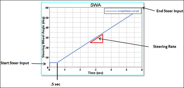 A Swept Steer event simulates a ramped steer input into a vehicle driving at a steady speed. The event is typically used to predict the steady state dynamic response of the vehicle. Input can be steering wheel angle or torque. Standard vehicle output requests are included in the event. A drive torque controller is included to maintain constant speed. A plot template is available to plot the results.