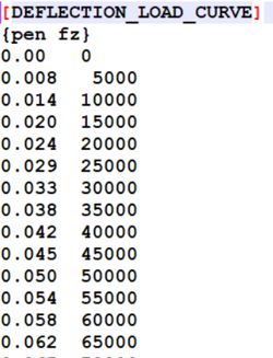 If a [DEFLECTION_LOAD_CURVE] block is present in tire property file, then the data inside the block is used to calculate the vertical force. In this case the VERTICAL_STIFFNESS value is ignored. The data in DEFLECTION_LOAD_CURVE should be monotonically increasing. An example of such table is given below: