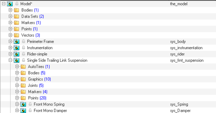 The image below shows the Project browser view of the systems on a fully populated front suspension model. The Single Side Trailing Link Suspension system has two “child” systems.