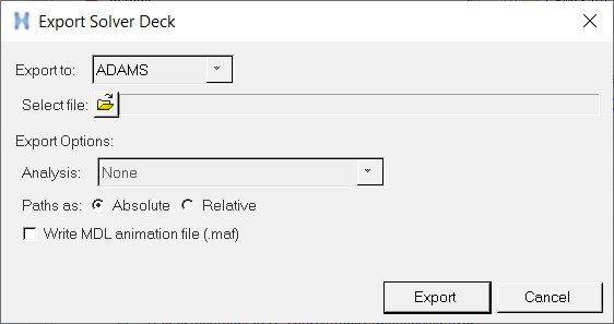 Option Description Analysis From the Analysis drop-down menu, select an analysis that you want to export with your model. This option is active only when there are multiple analyses in the model. Write MDL animation file (.maf) to create a reduced-size MDL file to only be used in HyperView. Export Solver Deck The Export Solver Deck dialog for the Adams solver mode has an additional choice to specify the .mtx path as Absolute or Relative. The .mtx file is a matrix file written out along with the solver deck file when the model contains flexbodies.