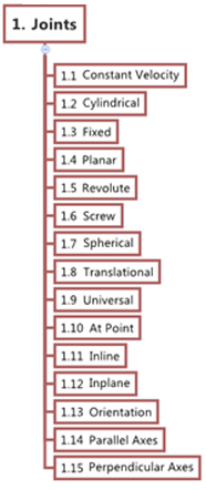 Joint Primitive Type Removes Number of Translational DOF Removes Number of Rotational DOF Removes Total Number of DOF Atpoint 3 0 3 Inline 2 0 2 Inplane 1 0 1 Orientation 0 3 3 Parallel Axis 0 2 2 Perpendicular 0 1 1 - Joint Constraints