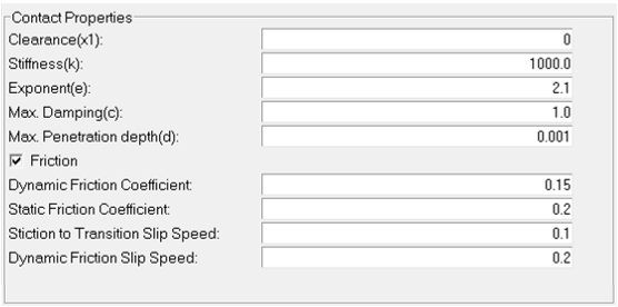 Friction data is required only if you select the friction option. It is used for the contact forces in constructing the leaves. The Coulomb model of friction calculates the friction force as the normal force multiplied by the coefficient of friction. This coefficient is calculated as a function of the slip velocity. It does not support stiction. The following explains the parameters used in the Friction option:
