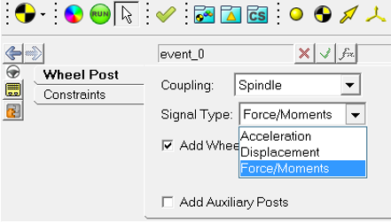 - Force/MomentNote: If the ‘Add Wheel Reaction Forces’ option is checked, the reaction forces are calculated at the wheels, after the static simulation and added to the Z-direction force signal provided by the user. The force signal is applied to the Wheel Post and can be seen in the n-Post Signal Manager.