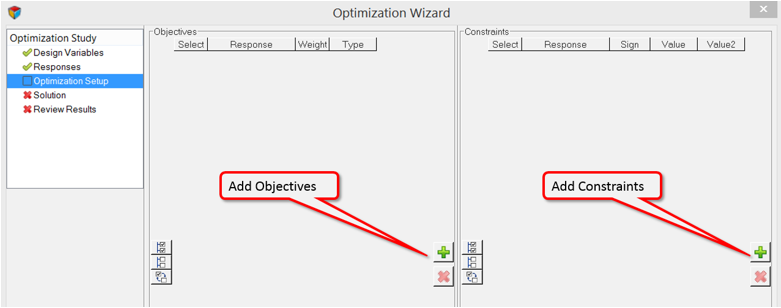 Restriction: Only one objective and/or constraint can be added per response. Thus, the maximum number of total objectives or constraints cannot exceed the total number of active responses in the study.
