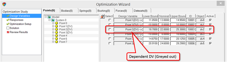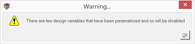 • If the data-member corresponding to an existing DV is made parametric (or dependent) outside the Optimization Wizard, then that DV will be disabled (or greyed out as shown below) and will not be considered for the optimization study. A warning will also be displayed when the wizard is launched.