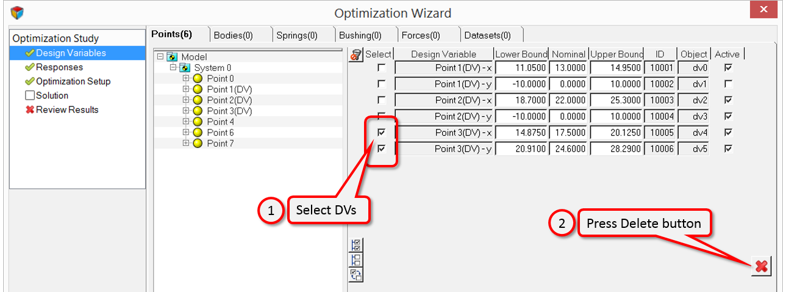 2. To delete a design variable, select the DV by checking the box located under the Select column and then clicking the Delete button.