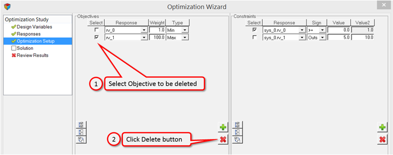 Existing Objectives and Constraints can be removed from the study by deleting them from the wizard.
