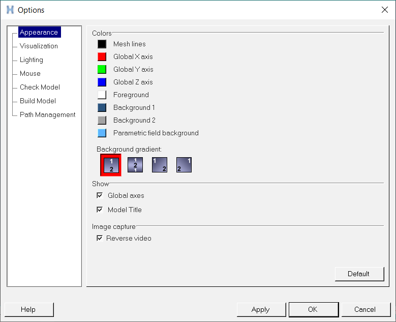 Foreground Changes the color of the foreground, global triad, and time step label. The default setting is white.