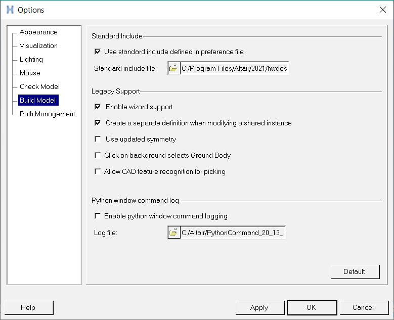 | Enable python window command logging | Activate this check box to enable saving commands in the Python window to a log file. See MotionView Python Reference Guide. | |