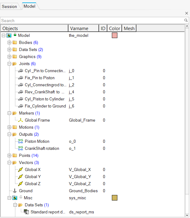 - Global default entities (such as Ground Body and Global Vectors) are listed at the beginning, under the Model folder, followed by the other container folders.
