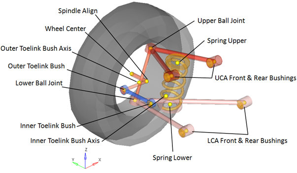 | UCA Front Bush | Bushing | Upper Control Arm | Subframe, Vehicle Body or Ground | UCA Front Bush | When the Compliant option is set to No, this bushing becomes a revolute joint. |