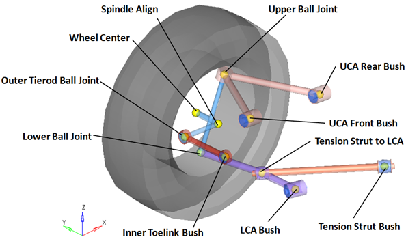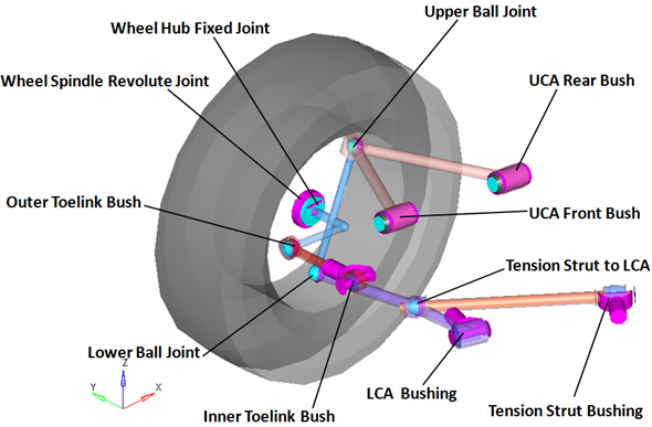 | Outer Toe Link Bush | Spherical Joint | Toe Link | Knuckle | Outer Toe Link Bush | When the Compliant option is set to No, the compliance for this joint is turned "Off" and behaves as a pure spherical joint. |