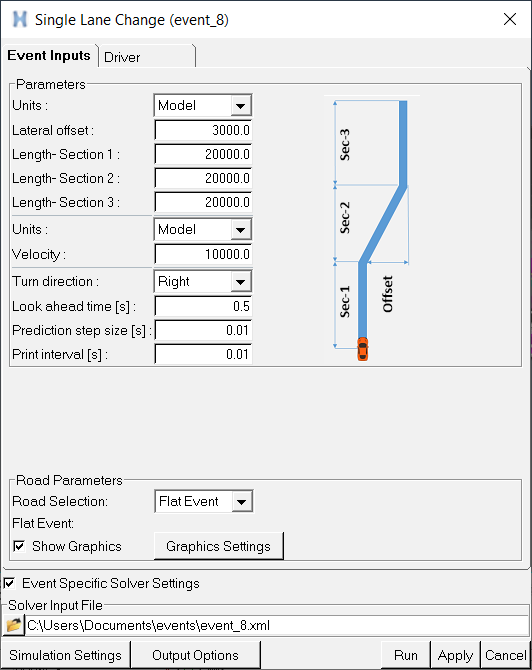 Lateral offset Lateral offset of the lanes. Length- Section 1 Length of the initial section of road in meters. Length- Section 2 Longitudinal length of the transition section of road where the lane change occurs. Length- Section 3 Length of the recovery straight section of road. Turn direction Direction the vehicle turns during the event (as seen by the driver). Velocity The initial speed of the vehicle. Look ahead time Look ahead time, used by the Driver Feedforward steering model. Prediction step size Maximum step size, used by the Driver Feedforward steering model. End time Absolute end time of the event, in seconds. Print interval Time interval of data output to the plot file (.plt) and graphics file (.h3d).