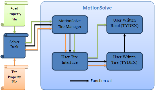 - Once this is established, the User tire interface will call the user written tire model many times during the course of the simulation passing in the information as described by the TYDEX format.