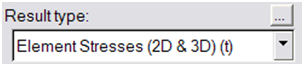 Result type Component options Displacement (v) Mag, X, Y, or Z. Stress (t) vonMises, Signed vonMises, P1(major), P2(mid), P3(minor), Pressure, MaxShear, Intensity, In-plane P1(major), In-plane P2(minor), XX, YY, ZZ, XY, YZ, or ZX. 1D stress Multiple options are listed for various elements such as: CELAS, CROD, CBAR, CBEAM, etc Energy (s) No component selection is necessary. -