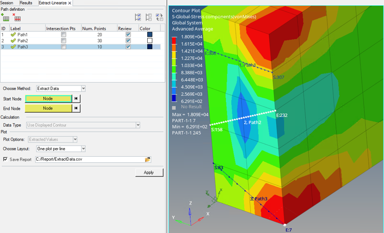 Extract stress data at various points along a path (also known as stress classification line) defined on solid elements and then calculate linearized stresses based on these extracted values.