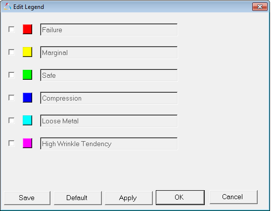 Save Save the current legend settings to a Tcl file, which can be used in preferences. Default Reset the default legend properties. Apply Apply the changes made to the legend. OK Apply the changes and exit the dialog. Cancel Disregard changes and exit the dialog.