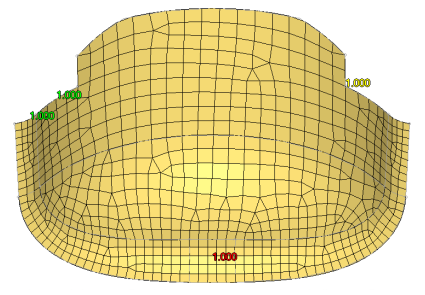 Surface Deviation meshing only works in an automatic mode; interactive meshing with the Secondary Automesh panel is not possible. However, use the refine function to set a specific desired mesh size for a point, line or surface face. This option accesses another temporary subpanel that is secondary to the Surface Deviation subpanel. From this subpanel, select fixed points, lines, or surfaces to define an area in which you desire a more refined mesh. You can specify a different element size for these areas, which displays as a color-coded numeric value: yellow for points, green for lines, or red for surfaces. An option to show all or show active toggles the view of these numeric values; show active displays only the refinement value for the most recently selected point, line or surface, while show all shows all values for all selected entities.