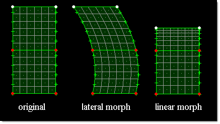 Create morph volumes in a rectangular configuration with the outer profile matched to selected lines and drag them through a mesh, along a line or nodelist, along a vector, or about an axis.