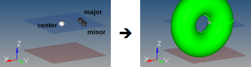 The three nodes must define a plane and cannot be collinear. The circle defined on that plane by the minor center and radius is then spun around the major center to create the torus.