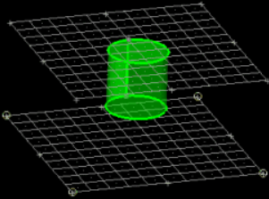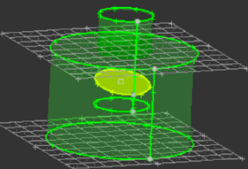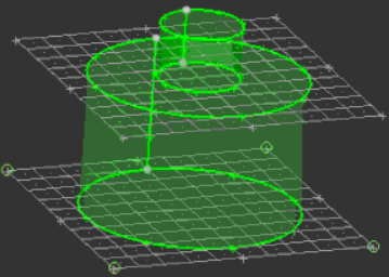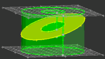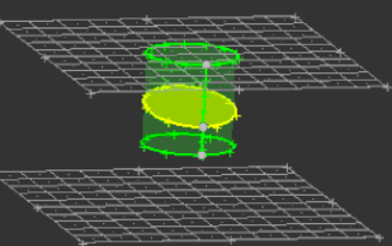 ![]() Figure 11. With Sweep Lines Set to N2 - N1. The line behind the cylinder is selected, and the green and blue nodes are N1 and N2. |