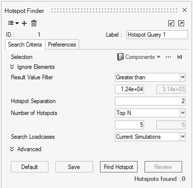The hotspot entities will be away from each other at least by a distance equal to the value you have entered. This method uses distances between nodes, element centroids, or component centers depending on the type of result chosen.By default, this tolerance value is taken to be 10% of the length of the biggest diagonal in the model bounding box.